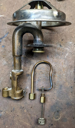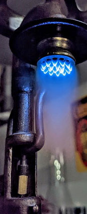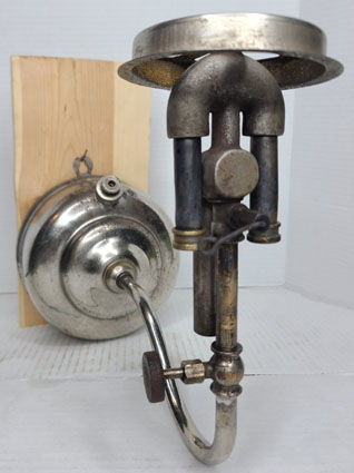 This Model 2A kerosene fueled lamp was made by Nagel Chase from 1922-24 and 1925-31 (Neil McRae). Once the lamp was preheated by a torch it was kept running by the flames from the preheater tube. The preheater tube was held in place by the screw in a projection from the mixing chamber casting (right image). Note the air tube difference from Model 2 above. This lamp is in Rob Butts’ collection.
