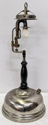 Two versions of the Model 10 Air-O-Lamp made by National Stamping and Electric Works, Chicago. The Sunshine Safety Lamp Company in Kansas City, MO, badged the lamp on the left and center (running). This lamp features the original artichoke shade The lamp on the right is marked as made by the manufacturer, Access to the filler plug and valve wheel on this model is artfully concealed under the sliding bell-shaped cover above the fount. These two lamps are in Neil McRae’s collection.