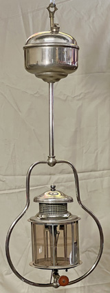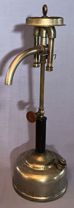 Neil McRae believes this lamp is an early version of Nulite Model 110M; a later version figured in a catalog has the air tube supporting the burner. The M designation in the model number means that it is match lighting, according to Neil, unlike the torch lighting model above. This lamp is in Wade Golden’s collection.