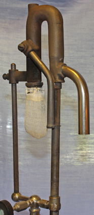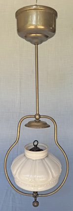 The New Specialty Mfg. Co., Council Bluffs, Iowa (bottom image), made this unique “Semi Pressure Single” hanging lamp in the style of a gasoline gravity lamp in the early 1900s. The serrated hanging hook (top left image) allows the user to level the lamp as the fuel is used from the tank. A small diameter brass tube (right image) carries the air from the bottom valve to the tank above. The valve at the lower right can be opened once an air pump is attached and the tank is then pressurized from this lower valve (upper right image). The glass cylinder and mantle holder are replacements.