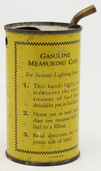 Coleman supplied cans for pouring preheating alcohol into their kerosene fueled lanterns such as Model 237. Most of these cans are of unpainted steel. This can, in Don Colston’s collection, is painted and with use directions on both sides. The bend in the tube allows the user to fill the cup without removing the globe.