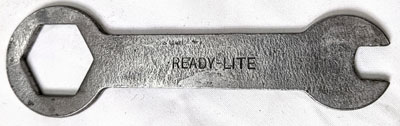 Toby Garner found this Ready-Lite stamped wrench in a bin with other parts. It likely came with an AGM lamp or lantern. The 5″ long wrench has openings of 15/16 & 3/8″, comparable to the wrenches above and below this one and fit a filler plug and valve wheel gland nut.