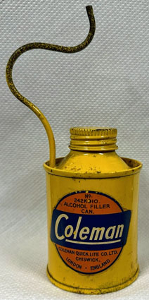Coleman England made this alcohol filler can, part No. 242K910, for their 242K lantern model, presumably in the mid- to late-1930s when that model would have been available. The can, in Elliott Fowle’s collection, is steel with a non-magnetic filler tube.