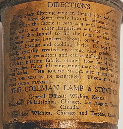 The Coleman Lamp & Stove Co., Wichita, made this No. 1 funnel before the mid-1930’s, presumably under license from the Schuyler Co. The directions for use label (lower image) is usually missing. This funnel is in Tim Treutler’s collection. To see an earlier Schuyler version of this funnel, click here.