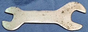 This wrench came with a Model 7 iron made by the Akron Lamp Co., circa 1937. The wrench is 3 9/16″ long with nut openings of 5/16″ & 1/4″. An identical wrench came with an Akron-Radiant iron made a decade later. This wrench and irons are in Nancy Remkus’ collection.