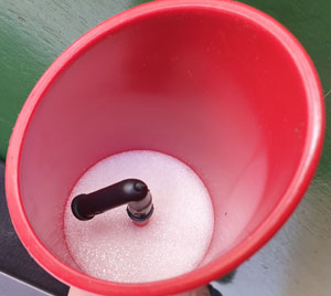 This is the current (2024) filter funnel that Coleman supplies with most of its liquid stoves and lanterns. The red plastic funnel has a removable white plastic filter material in the bottom (top image) that “traps dirt, water, and impurities.” The black angled air intake (top image) connects to an inner air tube in the bottom of the funnel to prevent overfilling when the user has enough fuel in the tank. This funnel, in Iain Sedgman’s collection, comes in a resealable storage bag.